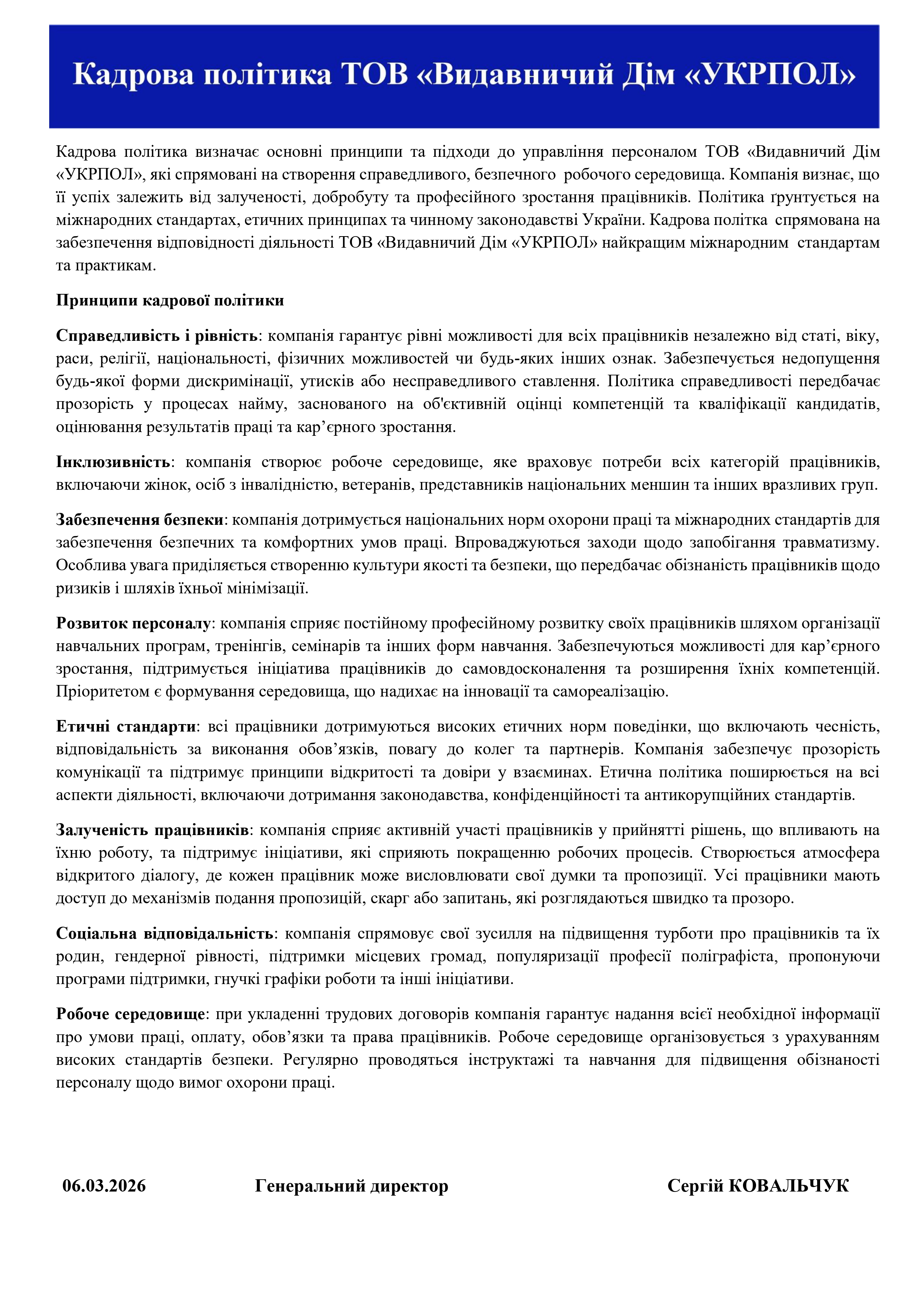 Кадрова політика ТОВ «Видавничий Дім «УКРПОЛ»